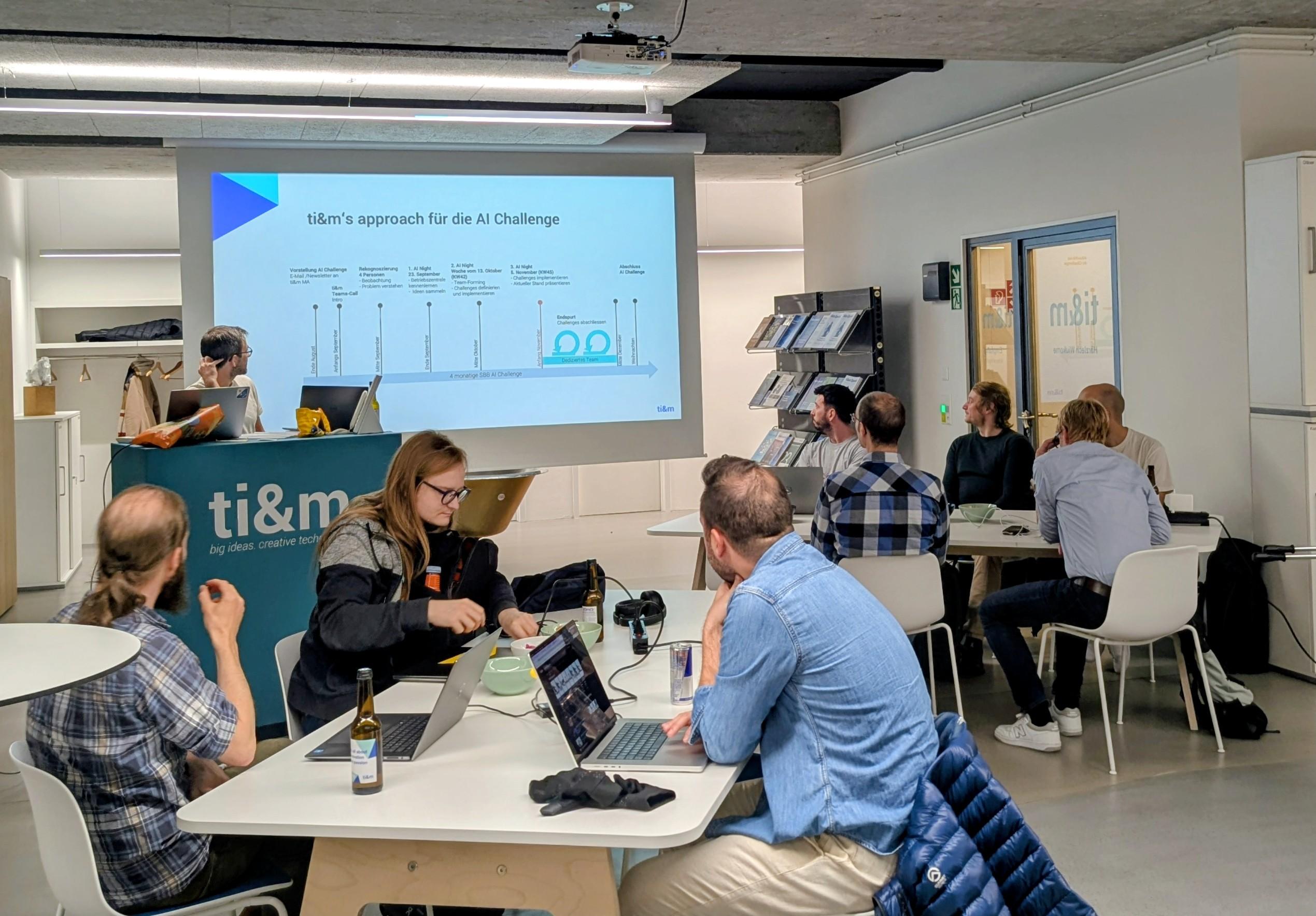 Um diese Herausforderung anzugehen, entschieden wir uns bewusst für ein kompaktes, kollaboratives Format: einen kleinen Hackathon in Form von drei AI Nights. An drei Abenden arbeiteten jeweils rund 20 motivierte Mitarbeitende von ti&m gemeinsam an konkreten Lösungsansätzen, unterstützt durch Fachpersonen aus der Betriebszentrale der SBB. Die erste AI Night fand in der SBB-Betriebszentrale in Olten statt, die zweite und dritte in unserer Berner Niederlassung.