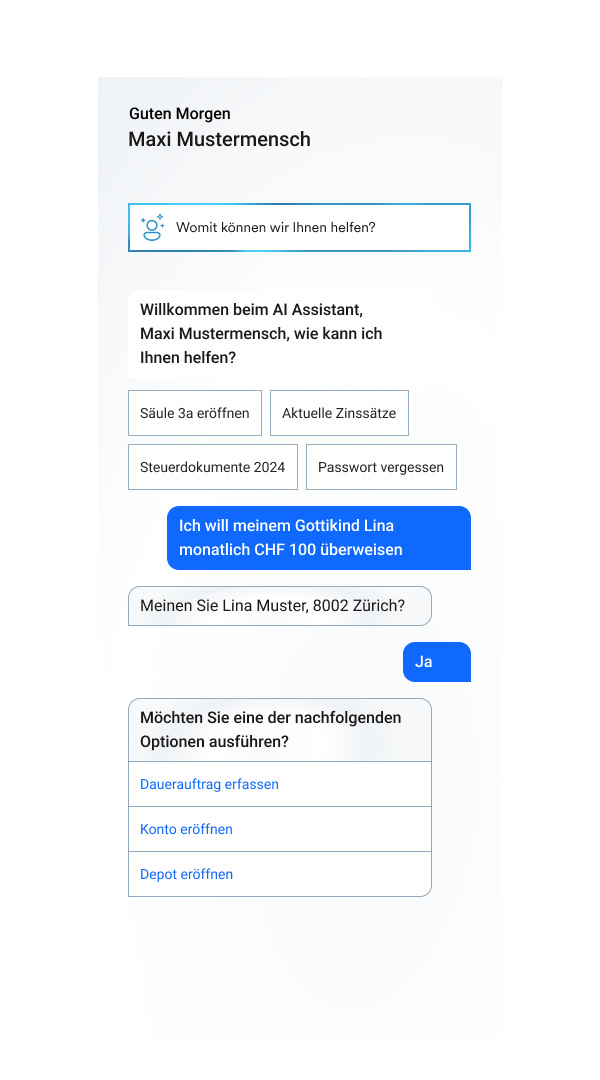 Many customers find the wide range of functions offered by modern mobile and ebanking overwhelming and are often only familiar with a fraction of the possibilities. Functions they rarely use, such as adjustments to e-bills, often cause them difficulties. This results in calls and emails to the support team. The AI Banking Assistant helps customers find the functions they are looking for quickly and easily, even if they are unfamiliar or rarely used. By allowing customers to interact using natural language, as they are already accustomed to in other areas, the AI Banking Assistant makes the full range of mobile and e-banking functions more accessible and creates an intuitive banking experience. Without the need for instruction and without any detours or frustration.